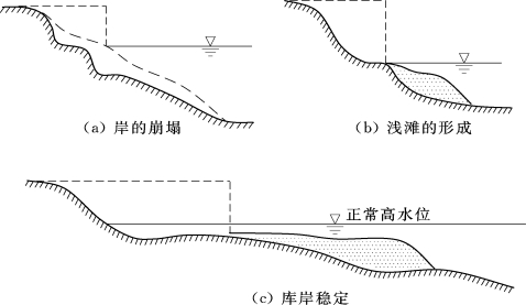 (1)岸的崩塌。水库蓄水后,一方面岸边土壤浸水,破坏了土体内部结构,另一方面,波浪冲击岸边,淘刷岸脚,使岸边水上部分失去支持,从而发生崩坍或滑坡。崩坍和滑坡的土石堆积于岸脚,有的构成新岸的扶壁,增加新岸的稳定性;有的又被波浪或湖流逐渐带走,于是新岸再次崩坍,库岸继续变动。