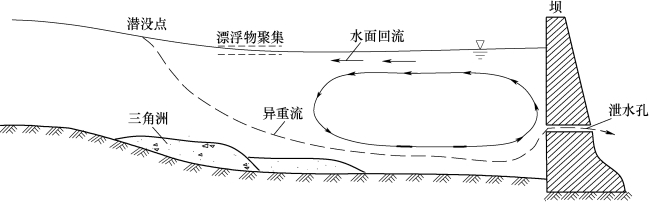 2)常年回水段行水段。最低库水位回水末端向大坝方向的库段。此库段水流具有一定的流速,流速沿程逐渐减小,泥沙淤积较均匀,粒径也由粗到细,呈带状分布,没有明显的三角洲。在有异重流产生的水库,此段常是异重流过渡区,异重流流速很小,可一直流至坝前,若不及时排放,异重流可被迫沿坝面上升,异重流可升至水面(利用此特点从泄水道内排出部分库水以减少水库淤积)。