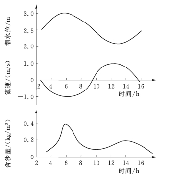 2)河口区的泥沙分布。河口区水流的含沙量随水位的涨落和流速的增减而发生相应的变化。当流速最大时,含沙量并不是最大;流速最小时,含沙量也不一定是最小。最大、最小含沙量一般要比最大、最小流速晚出现1~2h。这种滞后现象是因为含沙量要达到饱和状态需要一定的时间造成的。在流速增大的过程中,含沙量常处于不饱和状态,而流速减小的过程中,含沙量则处于饱和状态。在河口的盐水楔附近,由于絮凝作用强烈,造成大量细小泥沙聚集下沉,且流速大掀起和携带的泥沙多,故近底层出现的高沙量大多与最大流速出现的时间相适应,如图10.27所示。