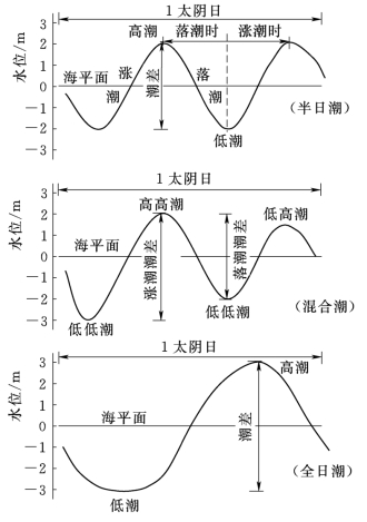 (4)混合潮。又可分为不规则的半日潮、不规则的日潮。