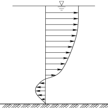 正是因为有上述的水流流向的顺逆变化,所以在潮水河的断面上的流速分布比较复杂。一般总是水浅和流速小的部位先转向,水深和流速大的部位转向较晚。因此,从平面上看,岸边先转向,中泓后转;从垂线上看,河底先转,水面后转。在憩流前后可测得水面与河底流向相反的垂线流速分布,如图10.22所示。同时也能测得中泓与两岸流速异向的横向流速分布。