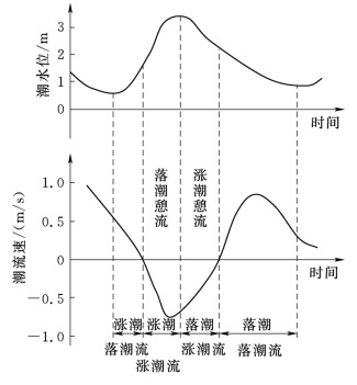 因为流速是有方向的,以水流流向海洋为正。由图可见,在一个涨落潮周期中,根据水位涨落和流速的方向,可分为4种潮流:①潮水位开始上涨后,潮波上溯对河水下泄开始产生顶托作用,使流速减小,但河水水面比降比较大,此时水流仍流向海洋,故将这种涨潮阶段流向海洋的水流称为涨潮落潮流;②涨潮阶段,随着水位的继续上涨,正向流速逐渐减小,当潮流与河流流速均衡时,流速为零,而后,随着潮波的继续向内陆推进,使流速转为负向,即水流流向内陆,把这种涨潮阶段由海洋流向内陆的水流称为涨潮涨潮流;③潮水位达到高潮后,开始落潮,但流向并不能立刻转向海洋,负流速仍继续一段时间,把这种落潮阶段由海洋流向内陆的水流,称为落潮涨潮流;④在落潮阶段,随着水位的降落,负向流速逐渐减小到零,而后随着潮流的继续减弱,流向又转为正向,即流向海洋,把这种落潮阶段由内陆流向海洋的水流称为落潮落潮流。