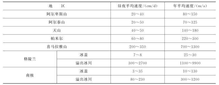 表10.4 世界主要冰川区大冰川的概略运动速度