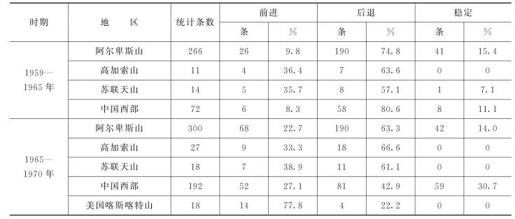 一般说冰川类型不同,所处地理位置不同,冰川的进退变化也具有差异性。但就全球来看,在相同的时间尺度内,冰川对气候波动的响应趋势是基本相似的。近20多年来,冰川状况有着明显的改变,由20世纪60年代初期的强烈退缩向缓慢退缩乃至出现相当数量冰川转向前进的情况。由表10.5可见,这种状况以阿尔卑斯山区、中国和美国的喀斯喀特山的冰川尤为明显。
