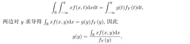 例1.4.2 设X,Y有连续的联合密度为f(x,y),让我们来算E[X|Y].因为E[X|Y]是Y可测的,故存在g使得g(Y)=E[X|Y].然后对任意y∈R有
