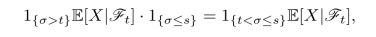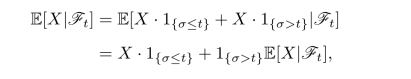 现在由条件期望的性质,只需证明E[X|Ft]关于Fσ可测就可以了.回忆上一节的一个练习中所断言的,随机变量Y是Fσ可测的当且仅当对任何s≥0,有Y·1{σ≤s}是Fs可测的.因此