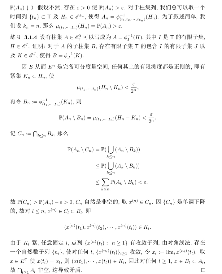 定理3.1.2 (Kolmogorov)设E是完备可分度量空间,E是对应的Borelσ-代数,则(E,E)上的任何相容的有限维分布族一定有一个实现.