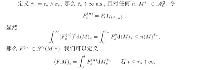 前面关于平方可积鞅的积分理论很漂亮,但是对于过程F和M限制较多.下面我们将It积分扩展至局部有界过程关于连续局部鞅的积分,这非常必要.设M=(Mt)t≥0是初值为零的连续局部鞅,那么我们可以选择停时序列{τn}使得τn↑∞a.s.且对任何n,Mτn=(Mt∧τn)t≥0是初值零的连续平方可积鞅(如果必要,甚至可以是有界的).
