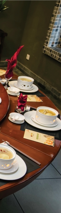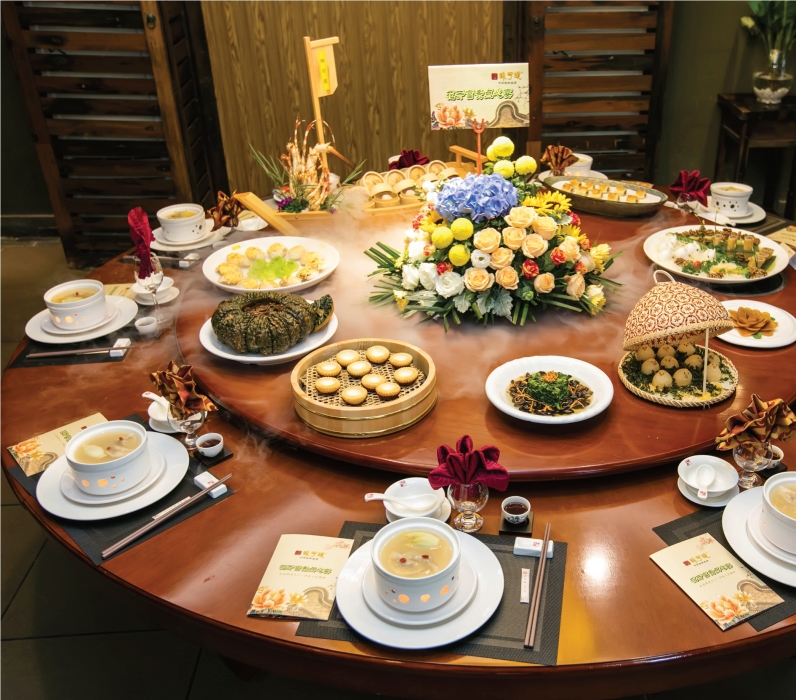 菜单根据宴席菜式要求精心设计而成:合理的菜式布局,丰富多彩的食材搭配,有龙虾、鲍鱼、海参、黑松露等;严谨、认真的多种烹调技法,如煎、炸、焗、炒、蒸、扣、炖、焖等。