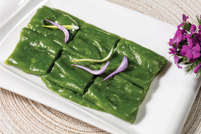 2.将肠粉专用粉与菠菜汁混合成粉浆,过筛备用;
