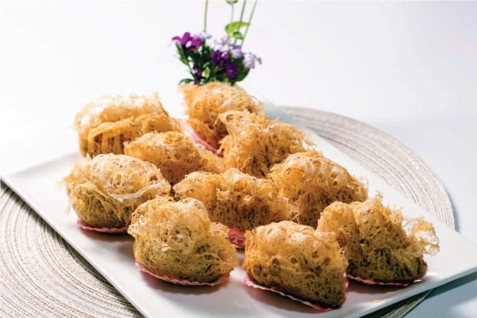 3.将芋角皮包入馅料成橄榄形,用中油温炸至表面呈蜂巢状、金黄色、酥松即可。