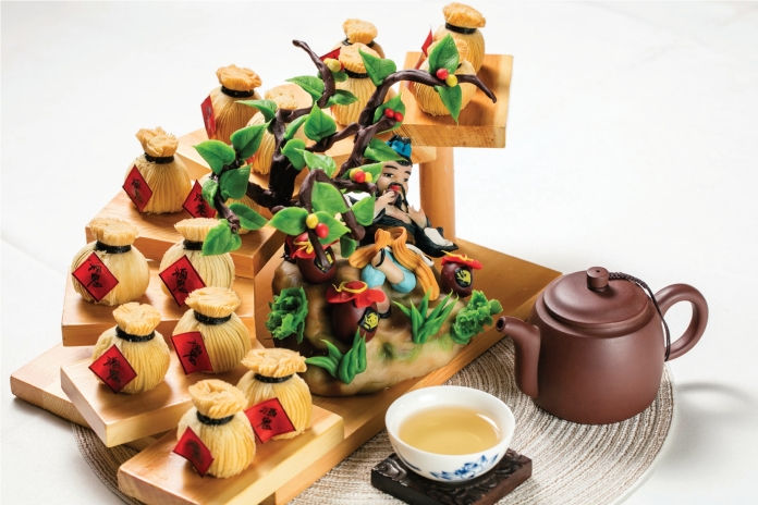 4.将已冷实的皮坯按规格横纹切片,开薄,包上花雕牛肉熟馅,成酒坛形生坯,用紫菜片扎捆,备用;