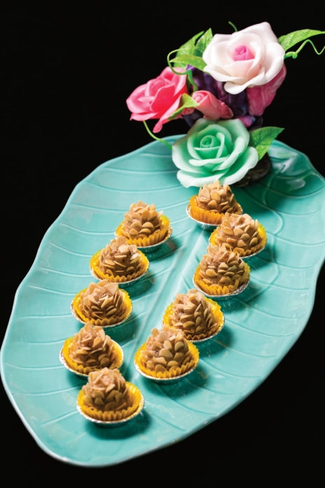 4.将鲜胶挤成大小均匀的球形,均匀插上杏仁片,用中油温炸熟成松果形即可。