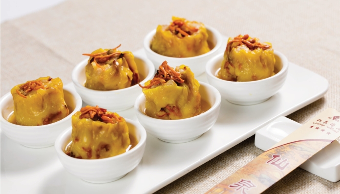 1.在每张干蒸皮上上馅,捏包成花樽形,上放大虾仁1只,大火蒸熟;