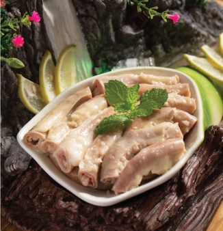 先把猪肠头清洗干净,烧水依次放入姜、葱、香料等,最后放入猪油,将猪肠头浸入煲内用小火(约100摄氏度水温)煲25分钟,放入调味料再煲5分钟,拿出改刀上盘摆好,撒上芝麻即可。