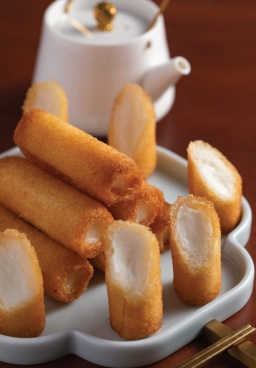 5.下锅油炸:先试油温,花生油文火加热至150~180摄氏度后,稳定油温,将切好的奶芯沾上少许蛋液和预先兑好的脆浆,将沾满脆浆的奶芯文火油炸至表皮呈金黄色,立刻捞上装盘即可。
