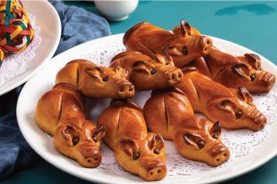 2.在案板上将面粉开窝,下糖浆、碱水和匀,下生油再拌,拌至均匀后静置30 分钟便成饼皮,开剂子,每个分别包入豆沙馅制成猪仔饼生坯,下盘烤熟至金黄色即可。