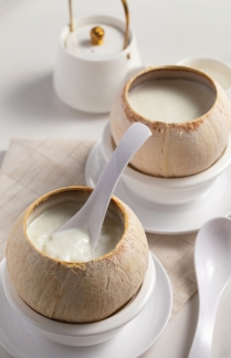 5.将椰青放入蒸柜内,将时间调至55分钟,温度调至120摄氏度,注意中途不可打开蒸柜,蒸至牛奶凝结便成。