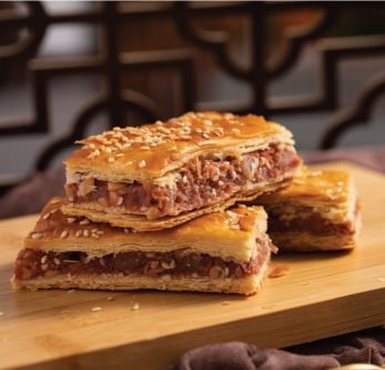 4.冰肉粒、花生、芝麻、南乳等全部混合制作成馅料。开好酥皮,面上和底部各一块酥皮,中间放入馅料,用刀切成小日字形,扫上蛋液,入烤炉烤至熟、呈金黄色便成。