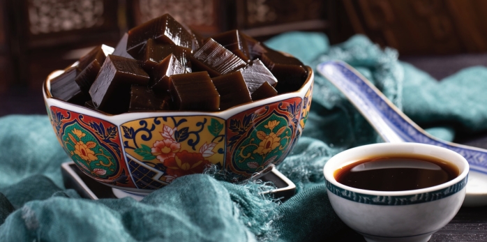5.把煮沸的凉粉成品倒入盘中,自然冷却,食用时切方粒,可加糖浆。