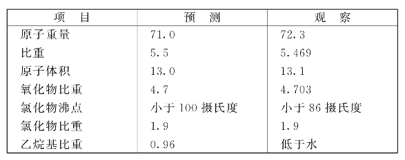 假设上面排列的数字没有误差,其数字32与44缺失,但表格中位置是空的。即是说,预测到缺失的两个数字的“特殊性”是可以的。同样的方法,门捷列夫的研究体现了元素之间的必然联系,他说,这些元素将根据它们原子的重量排序,其特殊变化也具有规律定期复发性,但分类是又有间隔。判断这些间隔周围的元素时,门捷列夫预测到了特定情况下缺失元素的性质,而如今这些缺失元素通过化学实验能够找到了。从下面锗元素的一些数据可以了解到,这些结果是与这位俄国科学家的预测是相符的: