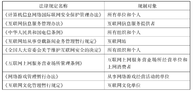 目前,我国立法在维持公民言论自由与国家安全、社会公共利益之间平衡的基础上,对网络有害信息内容的法律规定主要分为两类:一部分是传统立法在网络有害信息内容领域的延展适用;另一部分是网络安全领域专门法律规范。