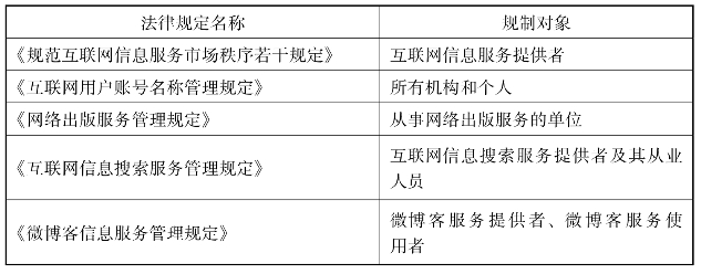 其中,2000年公布、2011年修订的《互联网信息服务管理办法》规定了九项互联网信息服务提供者不得制作、复制、发布、传播的信息内容,分别是:(1)反对宪法所确定的基本原则的;(2)危害国家安全,泄露国家秘密,颠覆国家政权,破坏国家统一的;(3)损害国家荣誉和利益的;(4)煽动民族仇恨、民族歧视,破坏民族团结的;(5)破坏国家宗教政策,宣扬邪教和封建迷信的;(6)散布谣言,扰乱社会秩序,破坏社会稳定的;(7)散布淫秽、色情、赌博、暴力、凶杀、恐怖或者教唆犯罪的;(8)侮辱或者诽谤他人,侵害他人合法权益的;(9)含有法律、行政法规禁止的其他内容的。可见,网络有害信息的规制对象分为危害国家安全和政权稳定的、危害公共利益的、危害公民个人权益三个层级。