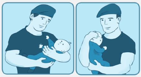 ●抱着“宝宝兵”坐着的时候,将他的头部置于你的臂弯处,或是靠在你的肩膀上。一手撑住头部和脖子,另一手托住臀部。