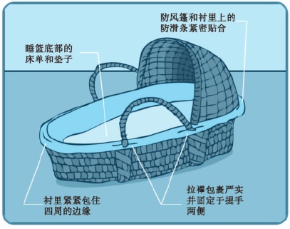 〇婴儿床或睡篮内不能放置枕头或被子。给“宝宝兵”盖上几层透气的薄织物,或是使用婴儿睡袋。