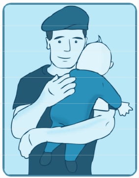 ●抱起“宝宝兵”,将他的头部靠在你的肩膀上,腹部靠在你的胸部。