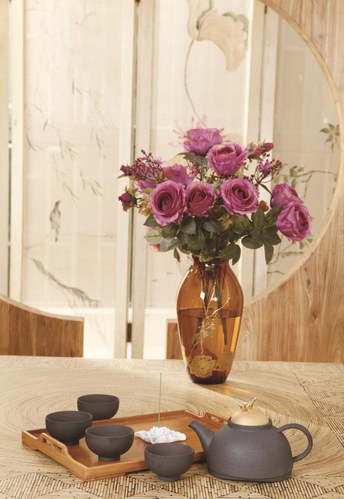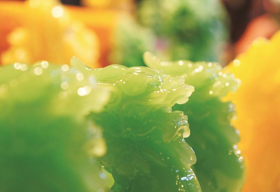 而玉石之美在于它的细腻、温润、含蓄幽雅。玉的颜色有草绿、葱绿、墨绿、灰白、乳白色,色调深沉柔和,配以香茗,形成一种特有的温润光滑的色彩。