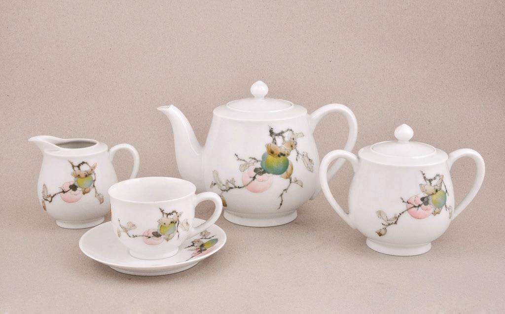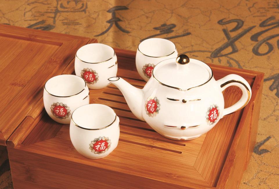 在元代,江西景德镇白瓷茶具已远销国外。如今,白瓷茶具更是面目一新。这种白釉茶具,适合冲泡各类茶叶。加之白瓷茶具造型精巧、装饰典雅,其外壁多绘有山川河流、四季花草、飞禽走兽、人物故事,或缀以名人书法,又颇具艺术欣赏价值,所以,使用最为普遍。