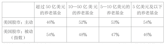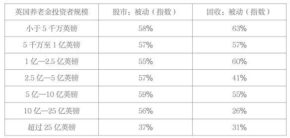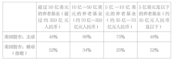 不同规模的美国养老金投资者都对指数基金有较高比例的配置,如下表所示: