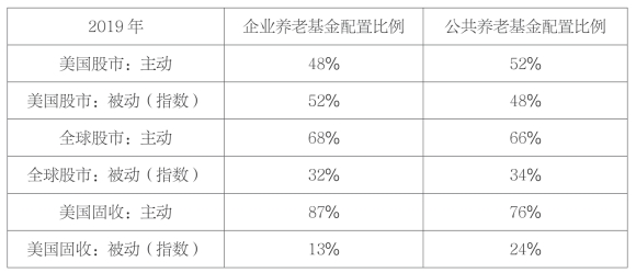 收集美国机构投资者资产配置统计数据的《格林威治2019年美国机构市场趋势报告》显示,平均而言,美国养老金投资者将其美国股市投资大致按照50%和50%的比例均分于主动和被动之间。美国养老金投资者也通常在国际股市和美国固定收益配置中使用指数基金,不过与美国股市相比配置稍低。