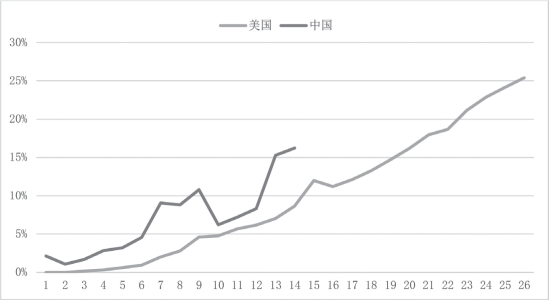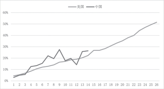 图3 指数基金规模占比趋势的中美市场对比 — 股票型基金