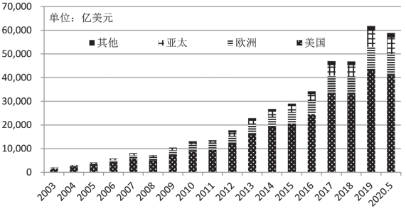 过往10年ETF高速发展,截至2020年5月末,全球ETF产品合计规模达5.9万亿美元。其中美国市场是目前全球最大的ETF市场,ETF规模占全球ETF合计规模2/3以上。