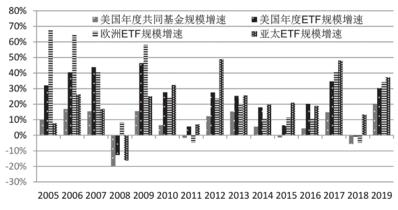 图2 美国市场ETF与共同基金增速,欧洲、亚太市场ETF增速
