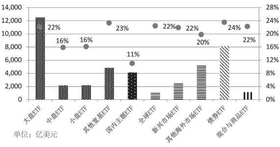 图4 美国市场各类ETF规模与过往三年复合规模增速(2017—2019)