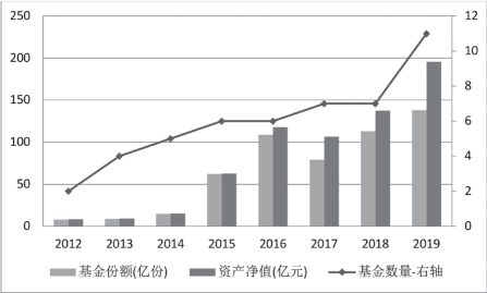 图5 2012年—2019年QDII跨境ETF的数量、资产净值与份额规模
