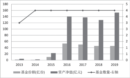 图4 2010年—2019年黄金ETF的数量、资产净值与份额规模