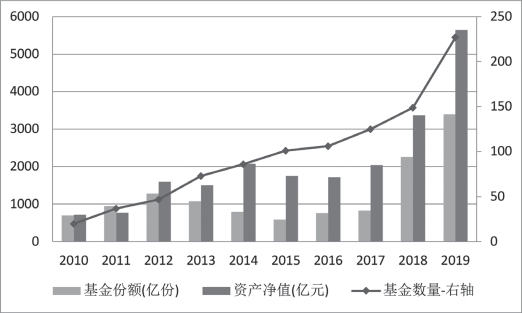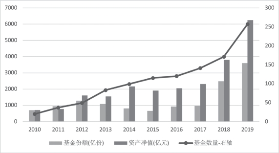 图1 2010年—2019年ETF的数量、资产净值与份额规模