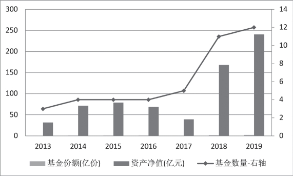 图2 2010年—2019年股票ETF的数量、资产净值与份额规模