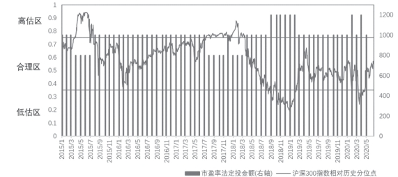 我们以沪深300指数作为参照指数对某被动指数型基金采用市盈率方法进行定投,采用进取型方案,20%级差,定投过程如下图所示。