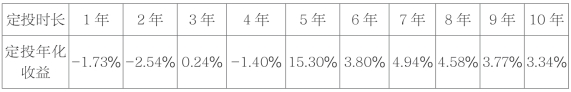 基金定投是一种以时间换取空间的投资方式,虽然时间的长短的确会影响投资收益,但并不是定投时间越长越好。定投的收益高低更多受到定投期间定投标的的走势形态以及最终退出时点标的的价格影响。下表为某投资者2010年6月1日开始对沪深300指数定投不同时间长度下所获得的年化收益情况。可以看到定投时间长度与定投年化收益并没有明显的相关关系。