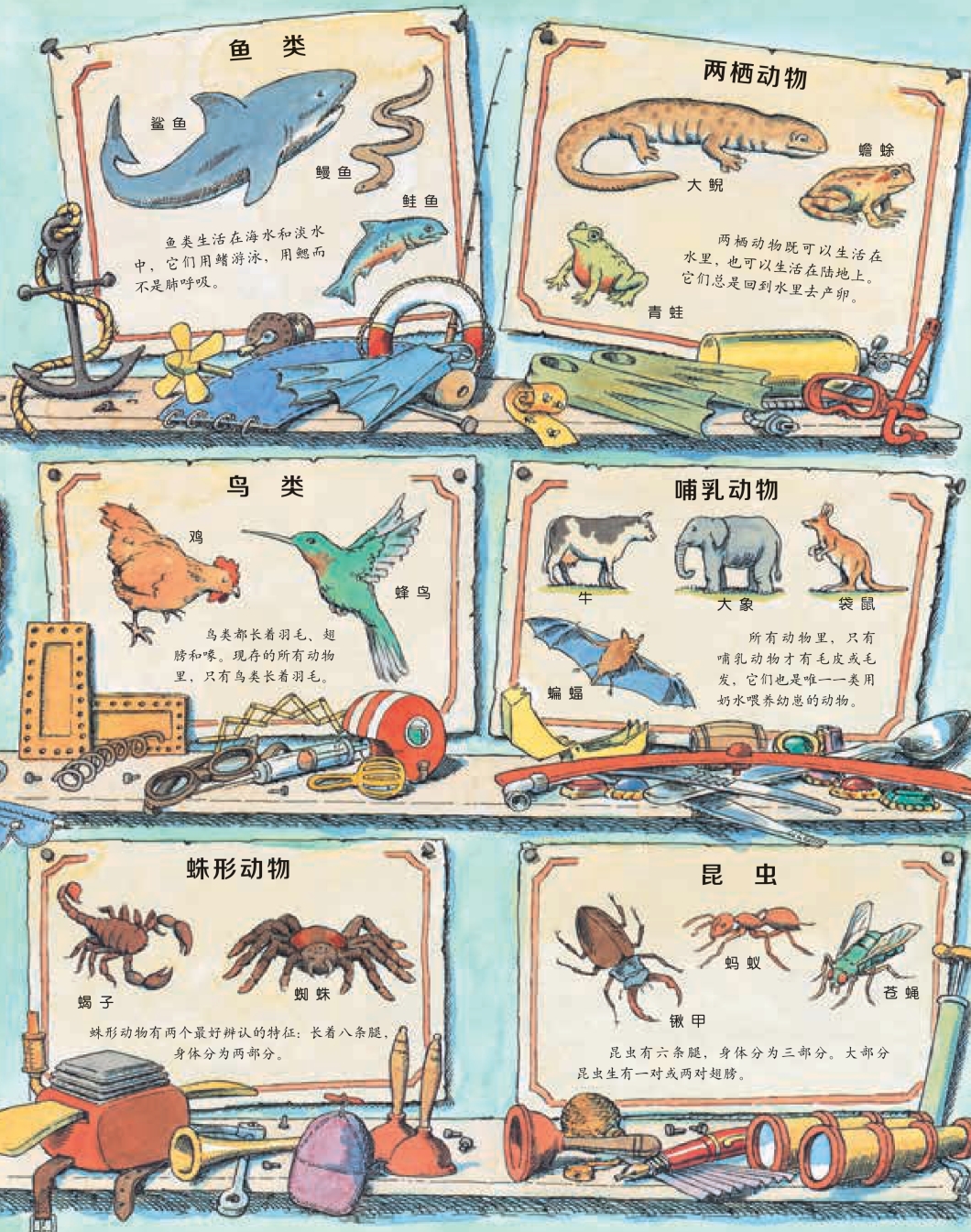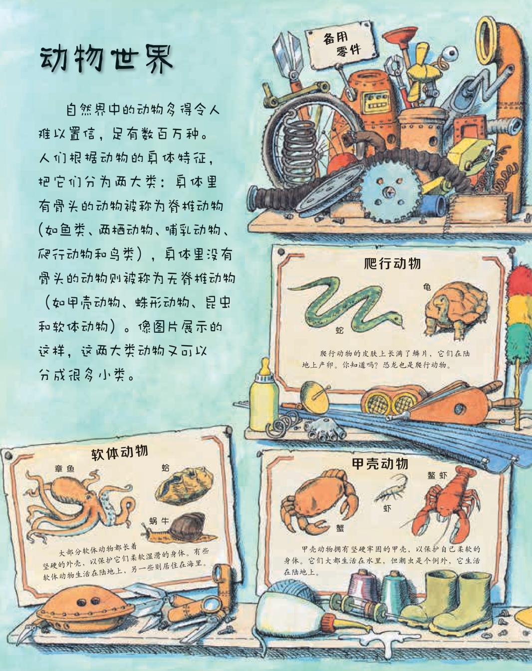 自然界中的动物多得令人难以置信,足有数百万种。人们根据动物的身体特征,把它们分为两大类:身体里有骨头的动物被称为脊椎动物(如鱼类、两栖动物、哺乳动物、爬行动物和鸟类),身体里没有骨头的动物则被称为无脊椎动物(如甲壳动物、蛛形动物、昆虫和软体动物)。像图片展示的这样,这两大类动物又可以分成很多小类。