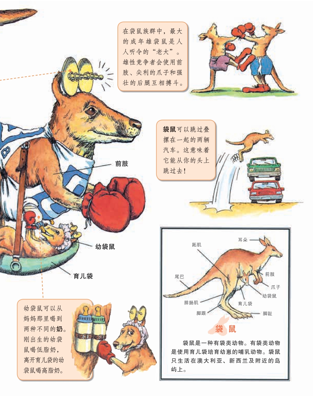 袋鼠的身体是专门为弹跳而生的。它们用长而强壮的后腿在地面上跳跃,利用尾巴保持平衡。刚出生的小袋鼠一点儿也不像自己的妈妈。它们看不见东西,全身没毛,只有蜜蜂那么大个儿。小袋鼠要慢慢爬进妈妈的育儿袋,在那里待上几个月,喝奶,长大,逐渐活蹦乱跳起来。
