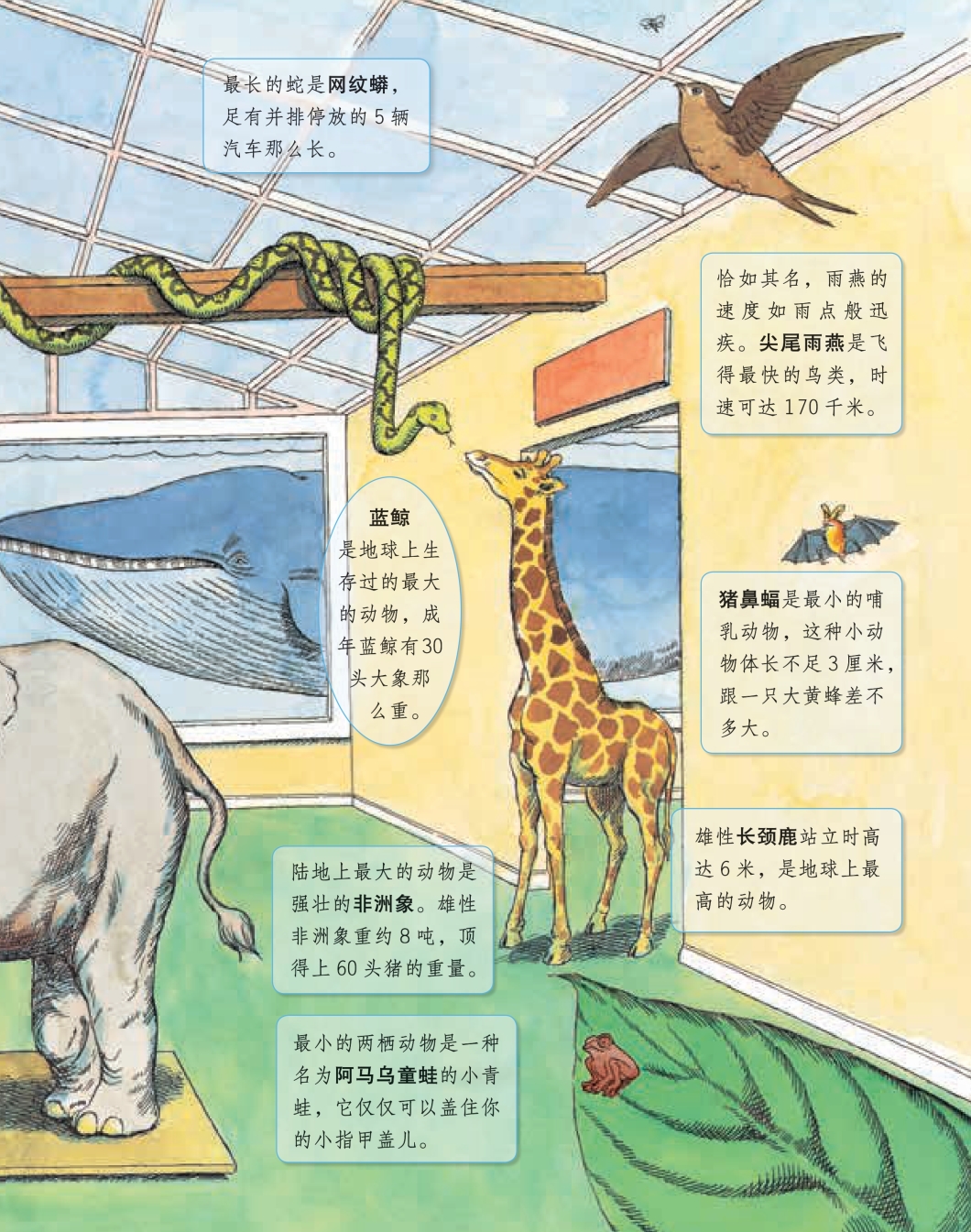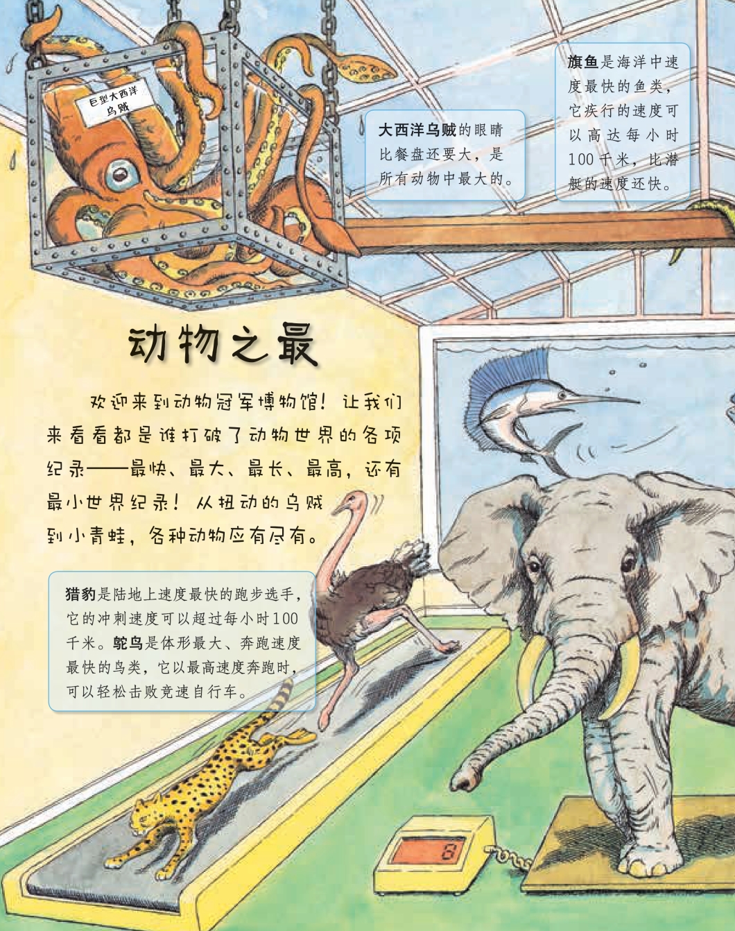 欢迎来到动物冠军博物馆!让我们来看看都是谁打破了动物世界的各项纪录—最快、最大、最长、最高,还有最小世界纪录!从扭动的乌贼到小青蛙,各种动物应有尽有。