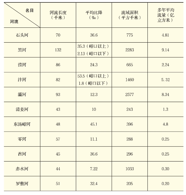 渭河全长818千米,流域面积13.43万平方千米。渭河流域可分为东西两部:西为黄土丘陵沟壑区,东为关中平原区。河源至宝鸡峡出口为上游,长430千米,河道狭窄,川峡相间,水流湍急,平均比降1/260。《山海经·海内东经》载:“渭水出鸟鼠同穴山,东注河,入华阴北。”北魏郦道元的《水经注·渭水》载:“渭水出首阳县首阳山渭首亭南谷山,在鸟鼠山西北,此县有高城岭,岭上有城号渭源城,渭水出焉。”唐代张籍的《登咸阳北寺楼》诗:“渭水西来直,秦山南去深。”