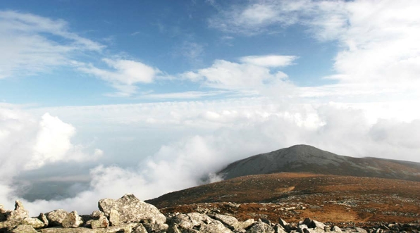 稀疏的草被在四五十米甚至百米宽的山梁上衬托着石海,雄壮、苍凉,而蓝天、白云使得这里显得更加空阔、高远,天地浑然,如常见的草原与戈壁,它却比草原戈壁多了高度,多了刚强,多了厚重,多了轻盈的云。草甸和乱石中间有积雪化成或者雨水汇集的水潭,给行者也许鸟兽带来福音,为这个几近残酷的生活环境提供了生机。