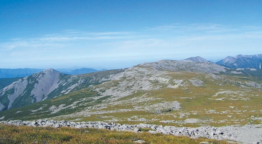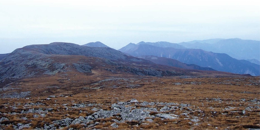 太白山山脊顶面是在中生代末第三纪初形成的准平原面的基础上,经第四纪的冰雪、寒冻风化和流水侵蚀等强烈改造作用而残留下来的古剥蚀面,古剥蚀面向南倾5~7度,其中以西跑马梁、鳌山及其以东和西北的平梁以及西跑马梁西端至灵光台间的长梁、拔仙台经南天门至凉水井间的穹状山脊最具有代表性。西跑马梁西端至灵光台间的长梁由北向南延伸,向南倾斜约5度,长约9千米。南段为宽0.5千米~2千米、长约4千米的平梁,梁顶平缓,有比高近30米的平缓小丘,也就是地貌学分类中的岗地,海拔2800~3200米。主峰拔仙台(东太白山)3767.2米,位于太白山的东端,是东秦岭山系的最高点。鳌山海拔3475.9米,位于跑马梁的西端,中间由海拔3200~3600米的跑马梁相连,构成太白山的主脊,它以3000米的巨大高差高出北侧的渭河谷地。